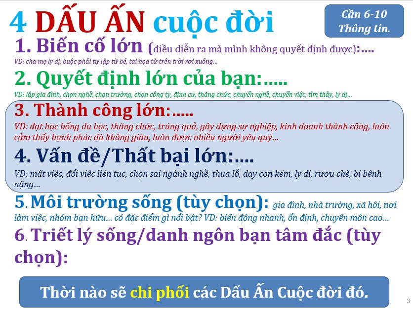 Nhiều bạn trên lớp làm 4 dấu ấn cuộc đời chưa khách quan, thì cũng chưa thấy rõ thời. Mình minh họa, các bạn đoán Thời của Chư Bát Giới, và hãy tập làm 4 dấu ấn cuộc đời cho chính mình nhé, và nghiệm lại "Hợp thời thì thành, trái thời thì bại".
