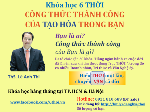 Với 20 năm kinh nghiệm quản lý, tư vấn cho nhiều công ty trong top 200 công ty lớn trong và ngoài nước, 15 năm nghiên cứu sâu Nhân Mệnh học, ThS Lê Anh Thi sẽ giúp xác định nhanh chóng mỗi người thuộc về một trong 6 mẫu người của toàn Nhân loại, đồng thời cũng là Thiên Thời của mỗi người. Thầy đã thực chứng kiến thức này ở 500 vĩ nhân từ xưa tới nay như Tôn Ngộ Không, Khổng Minh, Hồ Chí Minh, Donald Trump, Đức Phật… và phân tích thỏa đáng hàng chục vĩ nhân trên lớp, cả cả những tài năng vượt khó như Tôn Tẫn Giả điên, Nick Vujcic, Oprah Winfrey, Viktor Frankl… Tất cả các vĩ nhân này, dù biết hay không biết khái niệm “Thời”, đều hành xử theo đúng cách “Thuận Thời thì thành”, cho dù có gặp nghịch cảnh.