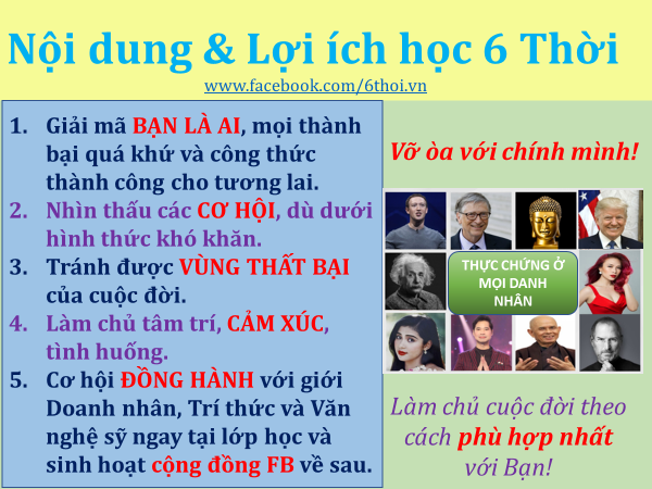 Khác với các công thức thành công chung chung mà các học giả nổi tiếng phương Tây thường dạy, khóa học 6 Thời sẽ chỉ ra công thức thành công nào PHÙ HỢP với bạn, còn công thức thành công nào KHÔNG PHÙ HỢP, thậm chí là chết người với Bạn. Cơ sở của việc này chính là mẫu người mà Tạo Hóa ban cho bạn, nên đảm bảo đúng đắn, sâu sắc và xác thực cao. Học viên nào cũng tự kiểm chứng được ít nhất 30-50 ví dụ thời của bản thân trước khi tin tưởng và hành xử theo Thời mà Tạo Hóa ban cho bạn.