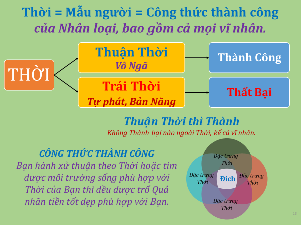 Thời, xét nghĩa bên ngoài, thì là giai đoạn thuận lợi của mỗi người (gặp thời), xét nghĩa bên trong chính là mẫu người của bạn. Dựa trên Luật Âm Dương Ngũ hành và Luật Nhân Quả, có 6 Thời ứng với 6 công thức thành công của toàn nhân loại, bao gồm cả mọi vĩ nhân từ xưa tới nay.